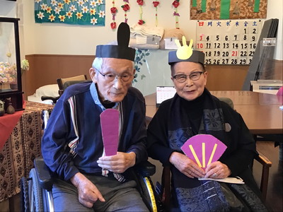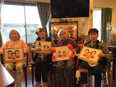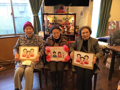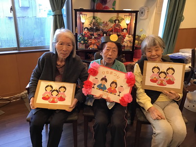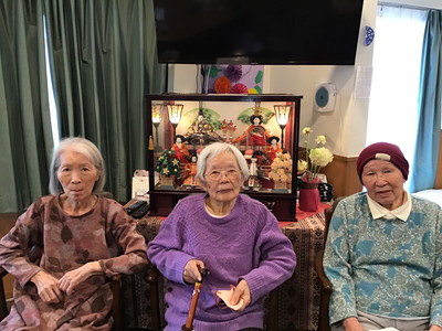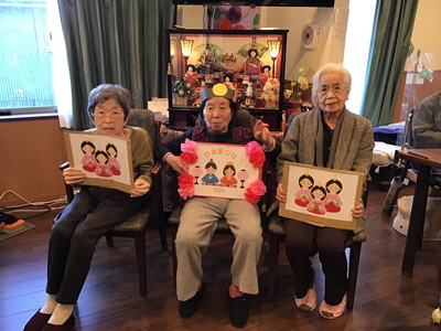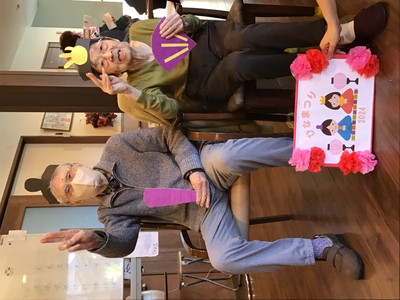 桃の節句のお雛様♡今年も・・明かりをつけましょぼんぼりに~♪とお雛様・お内裏様に扮し、皆様に楽しんでいただきました(^_-)-☆職員考案のひし餅ババロアも心を込めてとても美味しくいただきました。