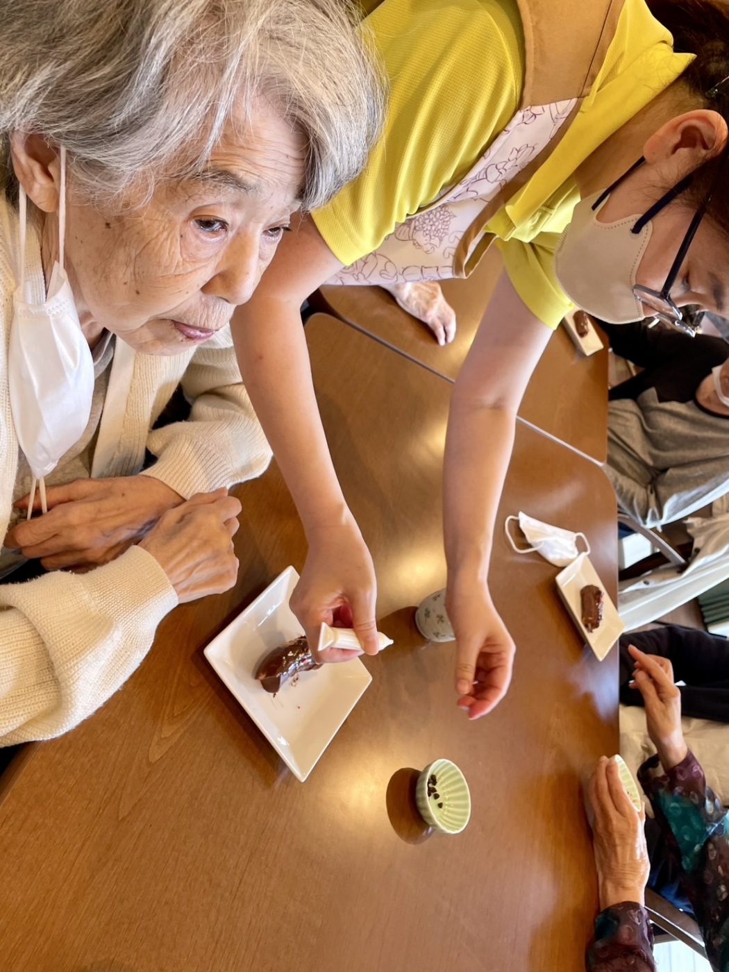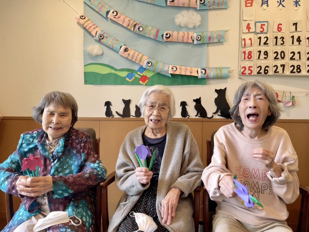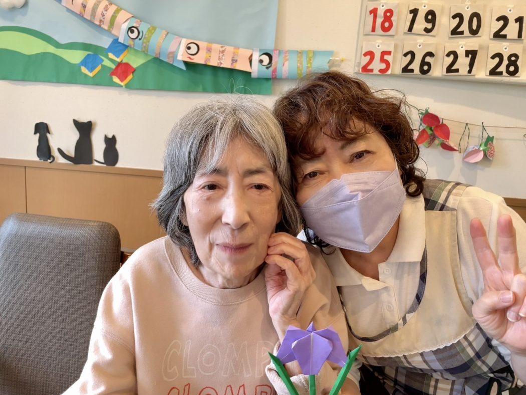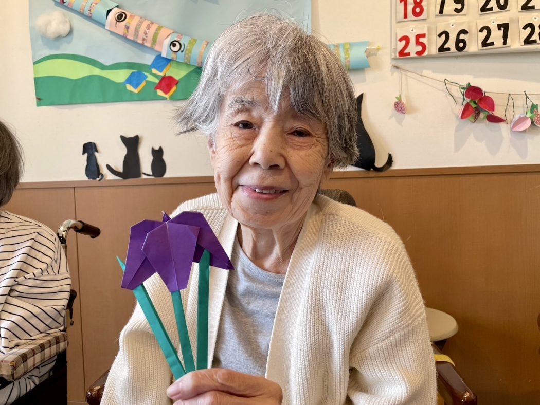 端午の節句のおやつは皆さん手作り(^_-)-☆チョコバナナを作り・・鯉のぼりのアレンジ♡あやめの折り紙作品も好評で、カメラを向けるとにっこり(‘◇’)ゞ