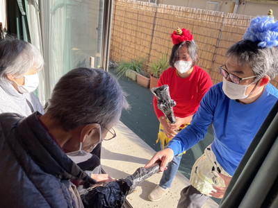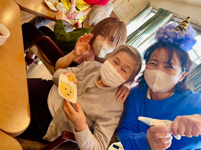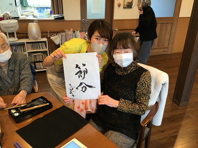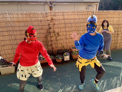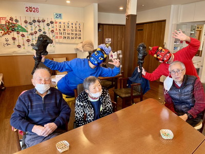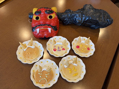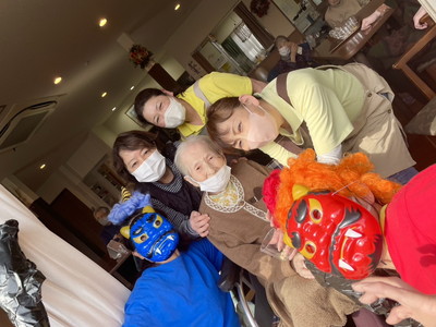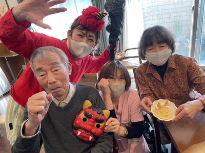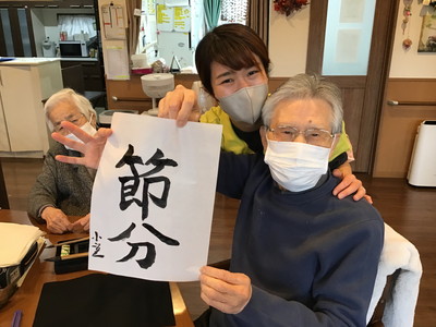 BLOG2026.02.08 👹節分イベント👹 しおり平戸 節分イベント 行いました👹 なにやらお庭から… 赤鬼・青鬼 お庭からやってきました!! 鬼退治スタート! 豆を投げ鬼を退散!👹お庭~外っ!!福は~内っ!! 鬼と仲良く写真撮影♡「おや?鬼さん もしやあなたは…」(笑) フロアに鬼さん入ってくれました( *´艸`)「こんにちは しおり平戸の皆さん」 こちらでも記念撮影ですっ さぁ豆まきの後はおやつレクレーション スタートです🍪 皆さまにもお手伝い頂きました( ^^) _U~~ どんどん焼かれていきます♡いい匂い♡ じゃーん!鬼のパンケーキ完成っ!!個性が出ていますね、おいしそう! お味はいかかですか? クリーム追加は鬼さんが!(#^.^#) ガッツポーズありがとうございます(^^♪ 皆様 良いご表情ですね 👹退治でスッキリ!節分イベント盛り上がりましたね! お習字にも挑戦!真剣な眼差し‥‥ 久しぶりだなぁ~ 緊張しちゃうわね💦上手に書けるかしら じゃーん!完成 出来ました!展示させて頂きます!(^^)! 素晴らしい!力強くて品がありますね!気持ちがこもっているのが非常に伝わります。ありがとうございました!! 小規模多機能しおり 平戸 〒240-0033 横浜市戸塚区平戸2-17-12 045-828-3215 詳細はこちら 関連する記事 小規模多機能 平戸 2026.01.14 🎍初詣🚙 小規模多機能 平戸 2026.01.08 🎍新年 壁画カレンダー🎍 小規模多機能 平戸 2026.01.02 🎍2026年 元旦🎍 小規模多機能 平戸 2025.12.28 🎅クリスマス会🎄
